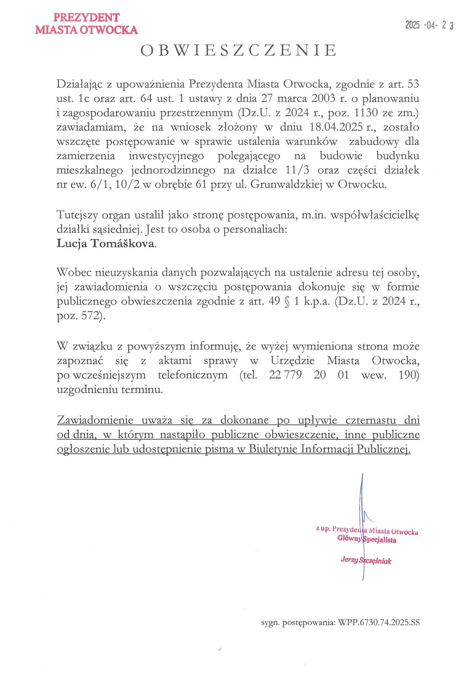 Treść zakładkiObwieszczenie Prezydenta Miasta Otwocka z dnia 23 kwietnia 2025 roku