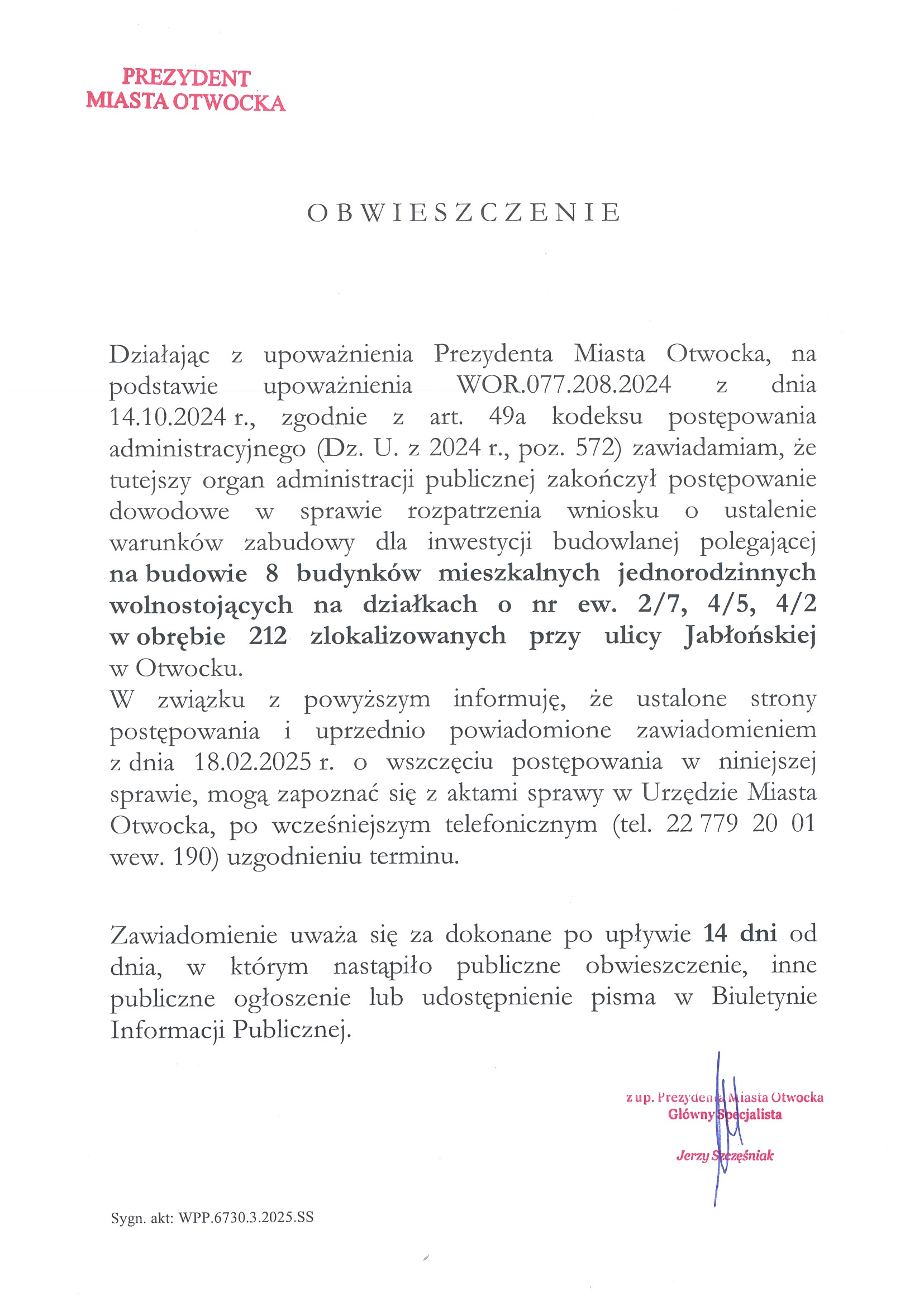 o zakończeniu postępowania dowodowego w sprawie rozpatrzenia wniosku o ustalenie warunków zabudowy dla inwestycji budowlanej polegającej na budowie 8 budynków mieszkalnych jednorodzinnych wolnostojących na działkach o nr ew. 2/7, 4/5, 4/2 w obrębie 212 zlokalizowanych przy ulicy Jabłońskiej w Otwocku