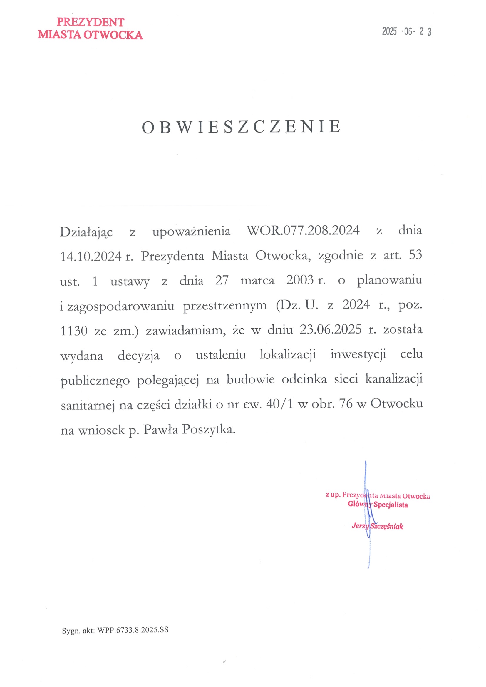 Treść zakładkiObwieszczenie Prezydenta Miasta Otwocka z dnia 23 czerwca 2025 roku