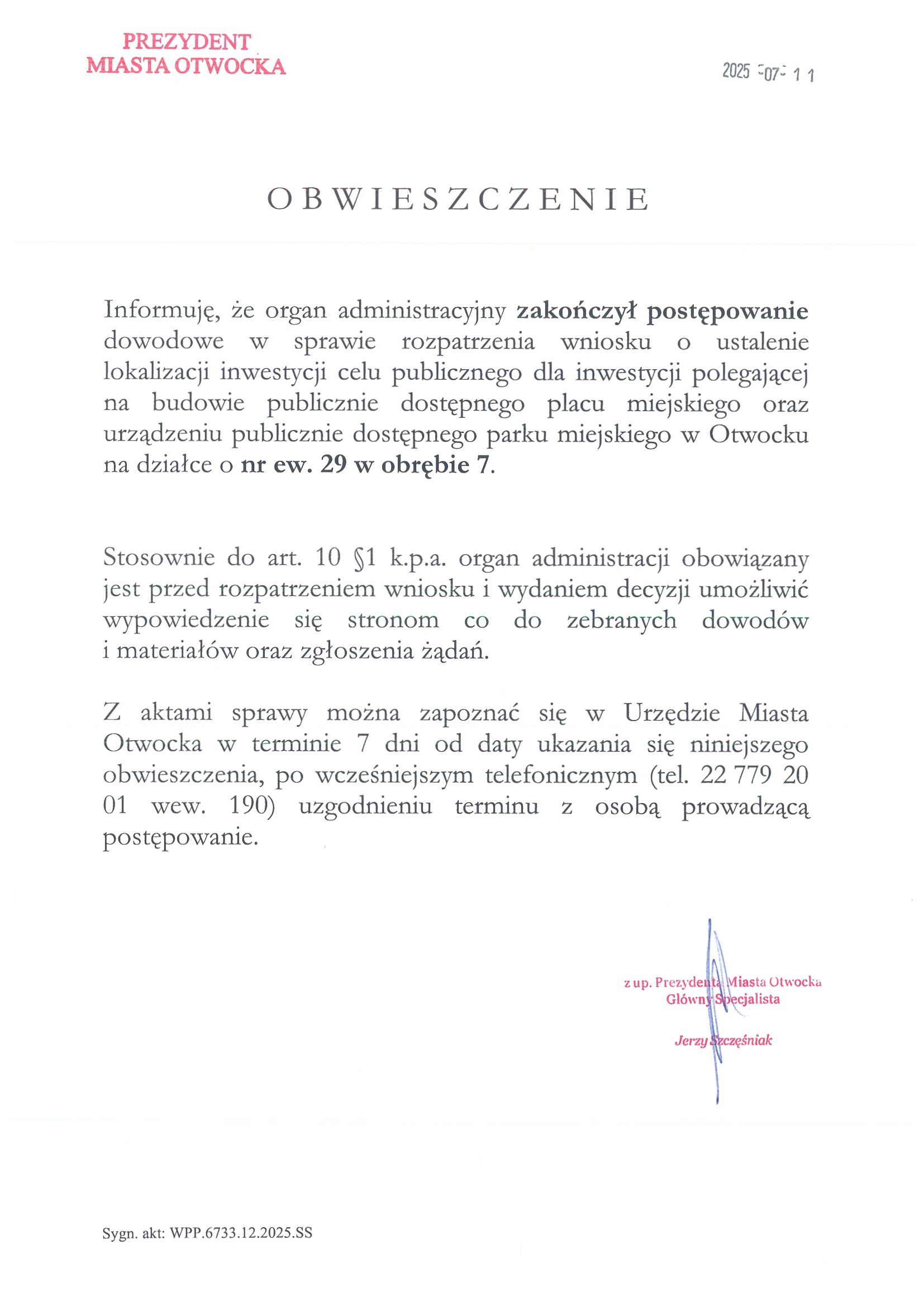 o zakończeniu postępowania w sprawie wydania decyzji o ustaleniu lokalizacji inwestycji celu publicznego dla inwestycji polegającej na budowie publicznie dostępnego placu miejskiego oraz urządzeniu publicznie dostępnego parku miejskiego w Otwocku na działce o nr ew. 29 w obrębie 7