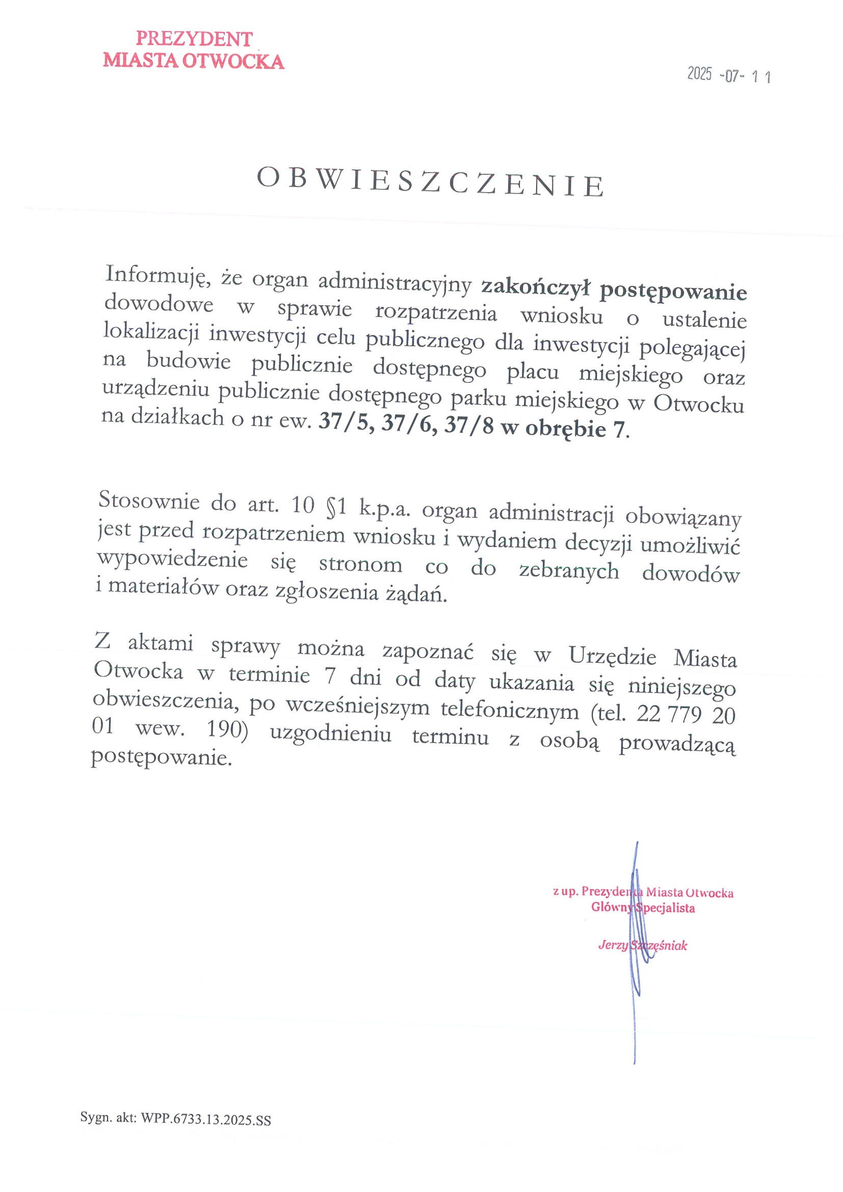 o zakończeniu postępowania w sprawie wydania decyzji o ustaleniu lokalizacji inwestycji celu publicznego dla inwestycji polegającej na budowie publicznie dostępnego placu miejskiego oraz urządzeniu publicznie dostępnego parku miejskiego w Otwocku na działkach o nr ew. 37/5, 37/6, 37/8 w obrębie 7