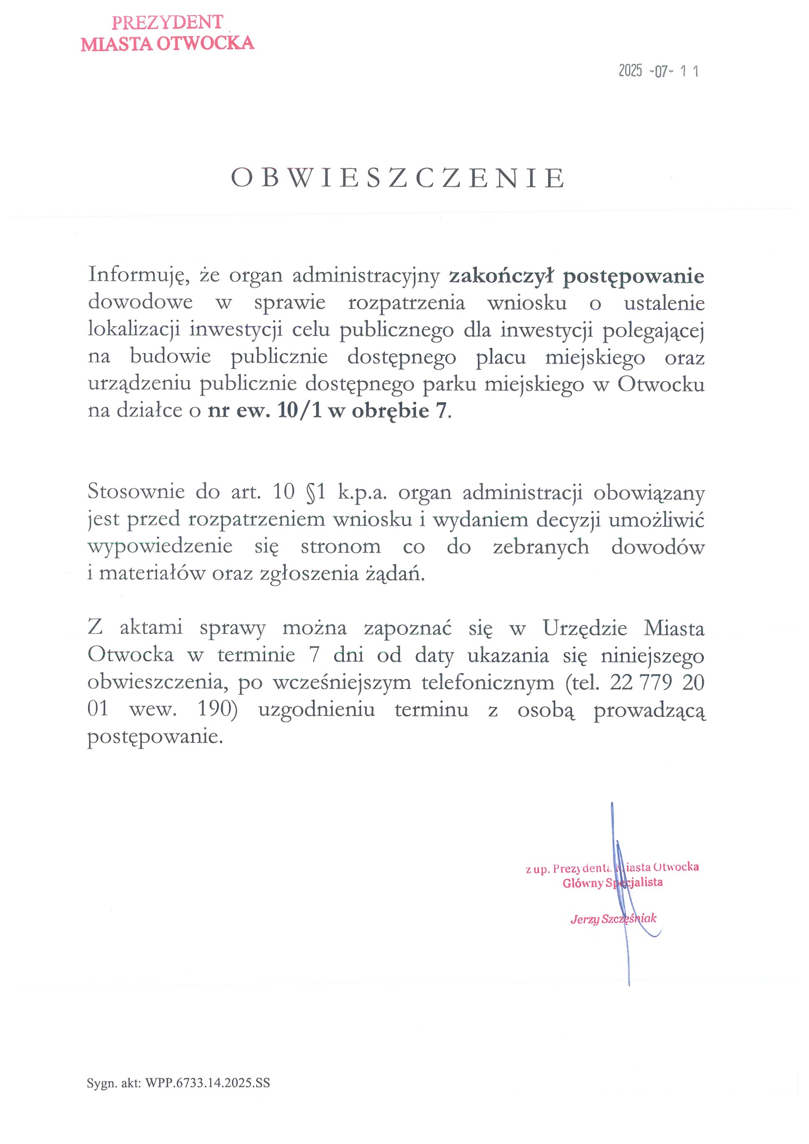 o zakończeniu postępowania w sprawie wydania decyzji o ustaleniu lokalizacji inwestycji celu publicznego dla inwestycji polegającej na budowie publicznie dostępnego placu miejskiego oraz urządzeniu publicznie dostępnego parku miejskiego w Otwocku na działce o nr ew. 10/1 w obrębie 7