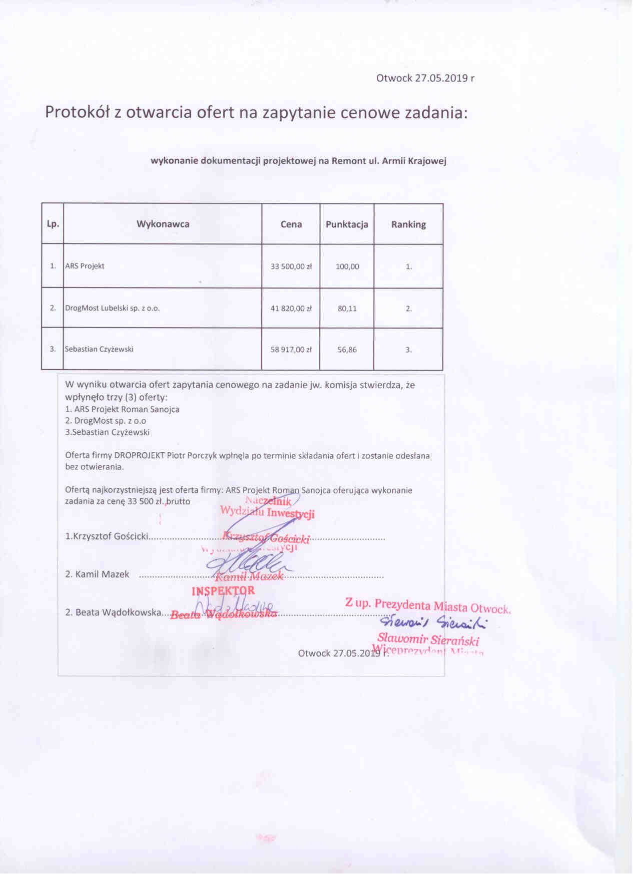 Protokół z otwarcia ofert na zapytanie cenowe zadania